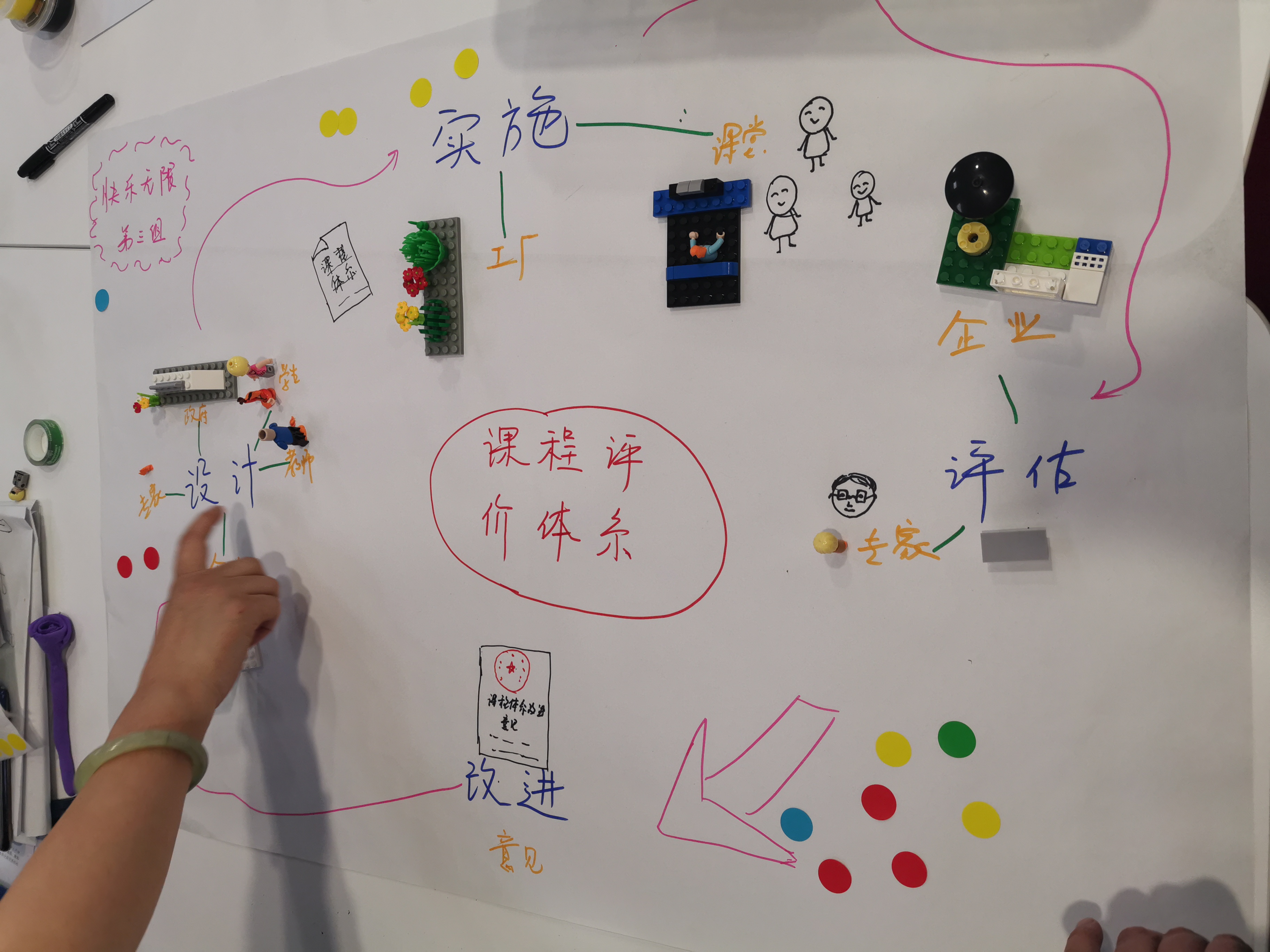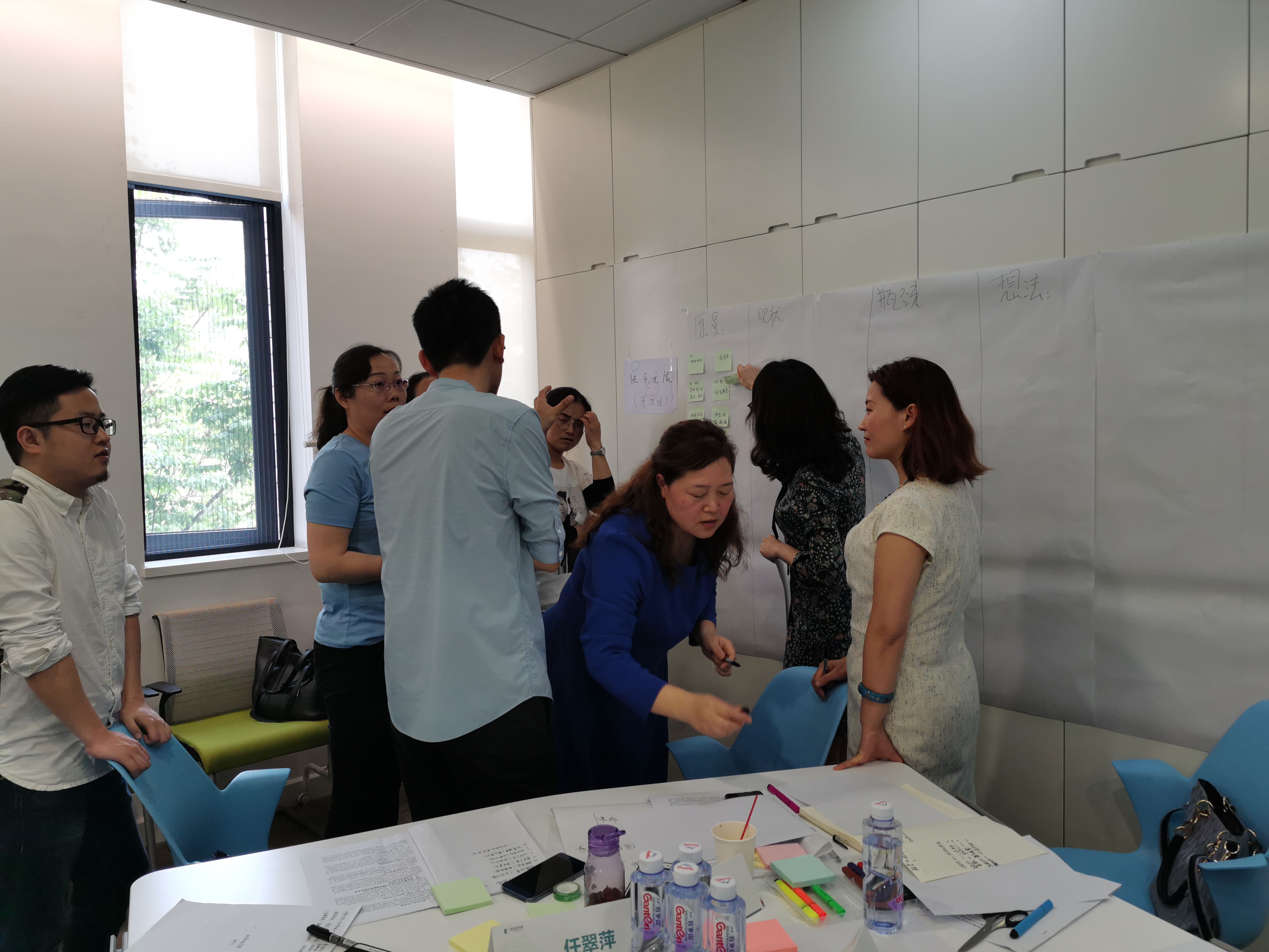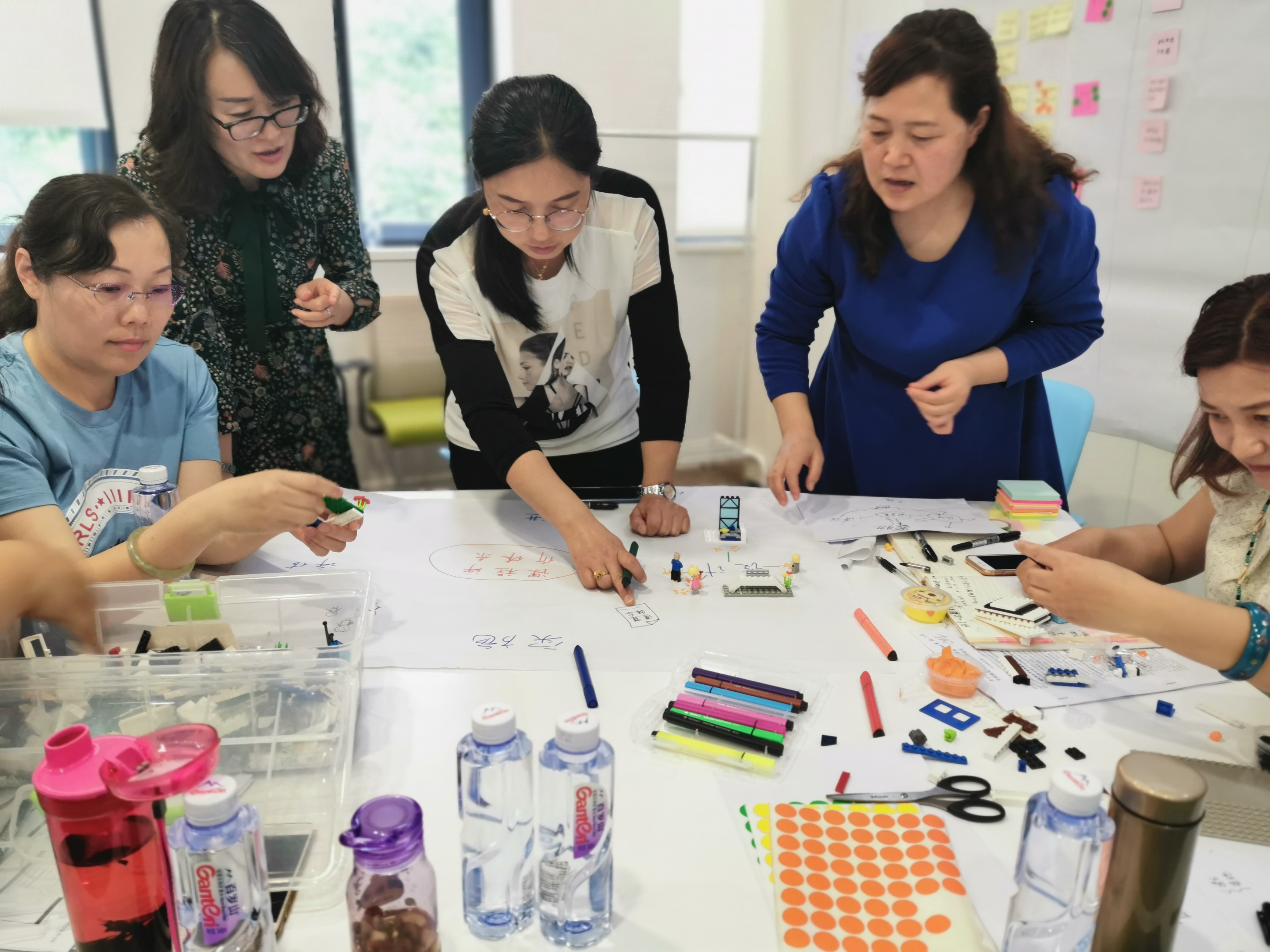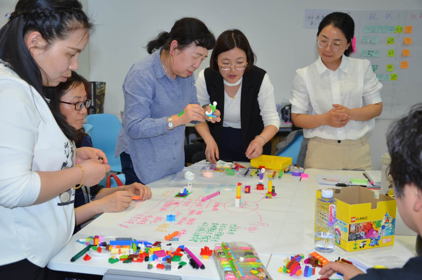 工坊进展过程中,黄鑫副院长首先给大家简要介绍了创新设计思维的原则,流程等,然后组织大家就“如何做好课程评价”的愿景、现状、瓶颈和想法四个板块进行头脑风暴和讨论。最后,各组使用乐高和图画做出模型,通过团体展演的方式,对本组的创新设计进行了讲述和演绎。
