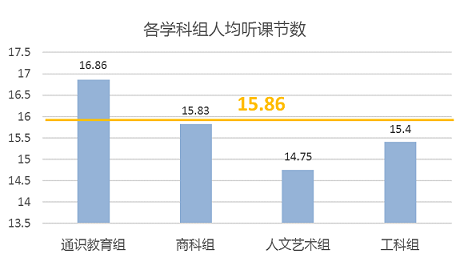 商科组和人文艺术组各有一位督导听课节数远小于组内其他成员,导致全组人均节数较少。工科组人均节数较少是由于5位督导中有3位未完成任务。