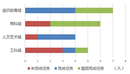(1)本学期73%的督导完成听课任务。其中,通识教育组全部完成任务。商科组和通识教育组均有3名以上督导超额完成任务(如图1所示)。