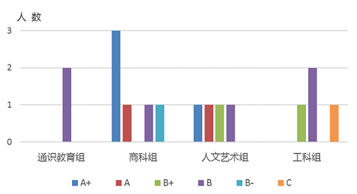 商科组6位督导中有5位工作情况为A或A+,整体工作质量较高;人文艺术组和通识教育组各有一位督导工作质量为A(如图5所示)。