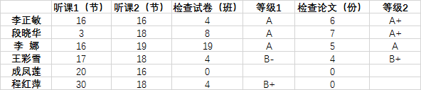 两次专项检查工作中,至少有一次达到A+的督导有:李正敏、张梅、王小辉、段晓华。另外,在本学期的专项检查或听课工作中,4位新进督导中有3位都表现非常出色:王小辉、闫虹、卢卓元。