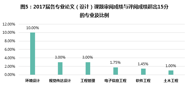 《西安欧亚学院本科毕业论文(设计)工作管理规范》规定审阅成绩与评阅成绩差值<15分,经过检查,除环境设计、视觉传达设计、土木工程、工程管理、软件工程、电子信息工程等专业出现审阅成绩与评阅成绩差值>15分的现象外,其余专业均符合要求。详见图5